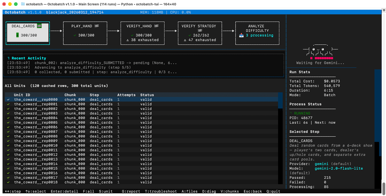 That’s a screenshot of the blackjack pipeline in Octobatch, the tool I built to run these pipelines at scale. That pipeline deals cards deterministically, asks the LLM to play each hand following a strategy described in plain English, then validates the results with deterministic code. Octobatch makes it easy to change the pipeline and rerun hundreds of hands, which is how I iterated through eight versions—and how I really learned the hard way that the March of Nines wasn’t just a theoretical problem but something I could watch happening in real time across hundreds of data points.