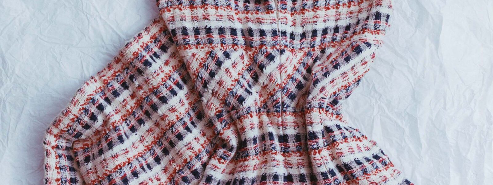 The design is quietly exacting: a midi-length silhouette with cap sleeves, its waist defined by a subtle shift in the direction of the tweed. Woven in ivory, navy, and coral, the fabric feels richly tactile yet softly graphic—a masterclass in Chanel’s precision and restraint. Donated anonymously.