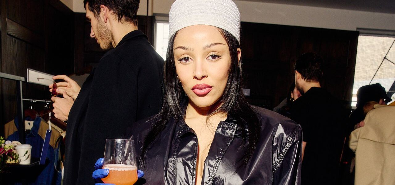 Inside, Doja Cat, Vogue’s April cover star and the day’s host, set the tone immediately. Moving through the space alongside her co-hosts Emma Chamberlain and Paloma Elsesser, Doja delivered a look lifted directly from the orbit of 1980s Yves Saint Laurent—or, as she put it, pausing to pose, “It’s giving YSL, even though it’s not fully YSL vintage.” It was all sculpted shoulders, black leather, electric blue gloves, a matching clutch, and a white straw fez perched just so.