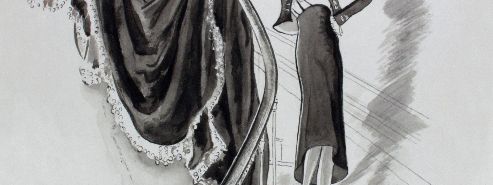 Moves into a new space on the Place Vendôme, which features a take-away boutique on the lower floor, called the Schiap Shop. The designer’s First collaboration with Salvador Dali takes the form of a compact in the shape of a telephone dial. “Schiaparelli Comes Out With Celestial Silhouette, Television Hat, Rug Wrap,” announces The Cincinnati Enquirer, explaining that the new shape thus: “With the figure draped in soft, spiral folds, narrow below the knee, and somehow reminiscent of the popular idea of Cleopatra.” The collection, featuring what would become Schiaparelli’s famous newsprint, is called Stop, Look, and Listen.