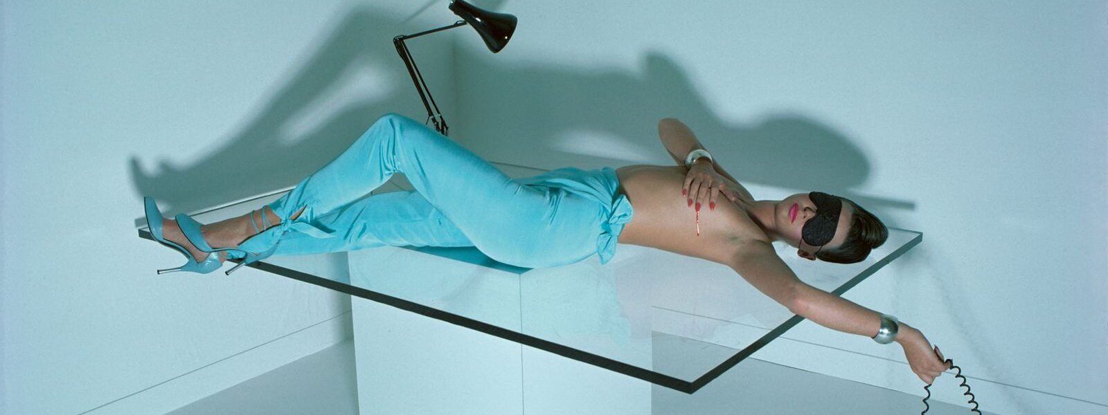 Kirk’s career began in the late 1970s; after studying medicine and then film history, he ended up working as an art director for advertising agency Saatchi and Saatchi. He had met the renowned stylist and art director Michael Roberts, then at the British Sunday Times in 1977, before he went on to Tatler, Vanity Fair, and the New Yorker, and Roberts and Kirk became part of the creative fervor of post-punk London. That’s how Kirk came to work with designer Antony Price (such as the image of a model reclining in still repose, for once, on a clinical white table), and doing three album covers for Roxy Music, namely Manifesto, Flesh and Blood, and Avalon.
