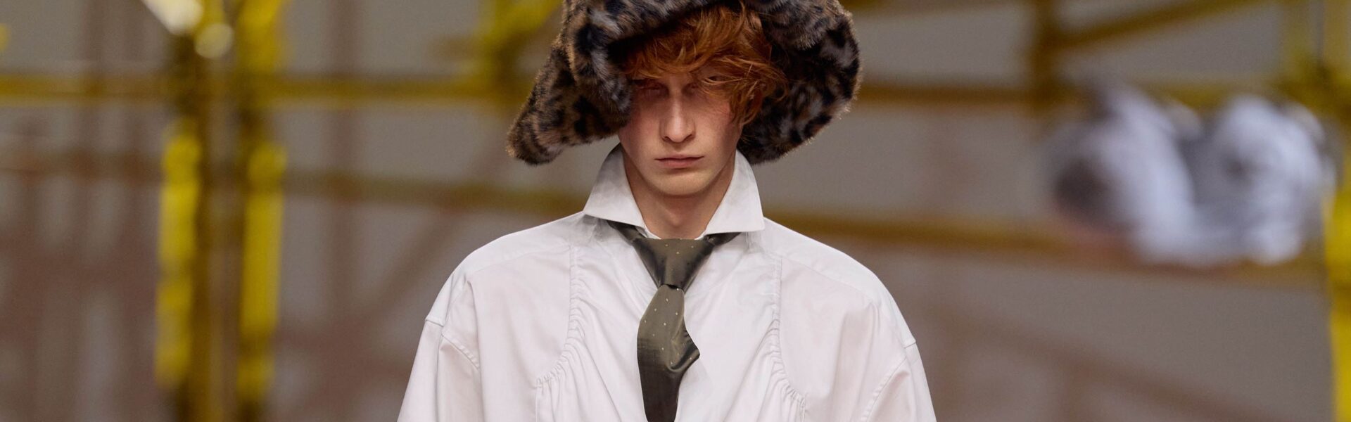 Waistcoats and shirting with incorporated gorpcore gusset pockets, some superfine Asics collab sneakers, jersey-cut garden gnome hats, check shirting and shorts overlaid with leopard print, pannier skirts worn under outerwear specially vented to let the panniers protrude, a tonal floral jacquard parka, and a quarter zip framed with a lattice of knit collection-icon emojis were further elements in this mixed-up and vaguely Mario-reminiscent aesthetic universe. A couple of sweaters featured more argyle patterning, but with the furniture of lines and diamonds so radically rearranged it bore almost no relationship with the controlling logic of the original.