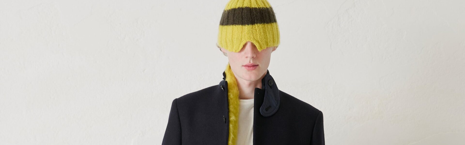 The palette stayed muted—browns, navy, green, gray—with only a few brighter accents. Accessories like mohair scarves and knitted beanies introduced a softer, more relaxed note, balancing the structure of the tailoring.