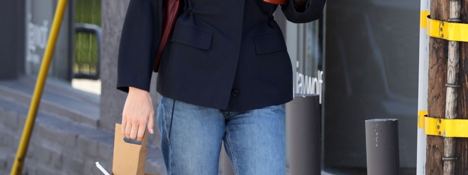 Jenner left a meeting dressed in The Row’s Tanera jacket from the fall 2025 collection—a navy button-up coat outfitted with a stand collar and cinched waist, which she paired with straight-leg jeans and her trusty black square-toe ballet flats.