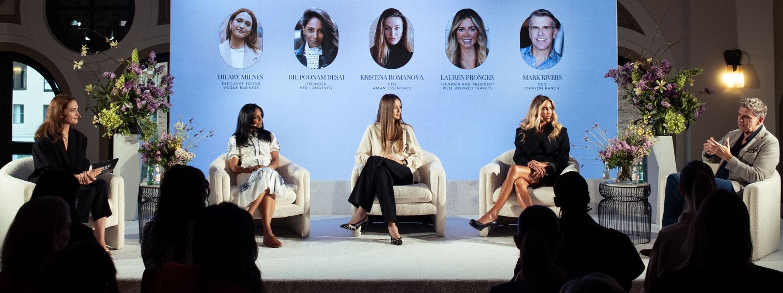 For this discussion, Dr. Poonam Desai, founder of Her Longevity; Kristina Romanova, CEO of Aman Essentials; Lauren Pronger, founder and president of Well Inspired Travels; and Mark Rivers, CEO of Canyon Ranch, joined Hilary to speak about the opportunities in wellness travel. “The average consumer is so focused on their wealth, which is now their health,” said Dr. Desai, whose firm connects clients to medical facilities all over the world. Pronger, who launched her own wellness travel agency in 2017, said clients are focusing more on how they feel, both during and after a trip. Canyon Ranch, a wellness resort founded in 1979, has gone deeper on experiences as demand continues to grow, “especially at the higher end consumer strata”, said Rivers, describing a customer that’s more educated and discerning than in years past.