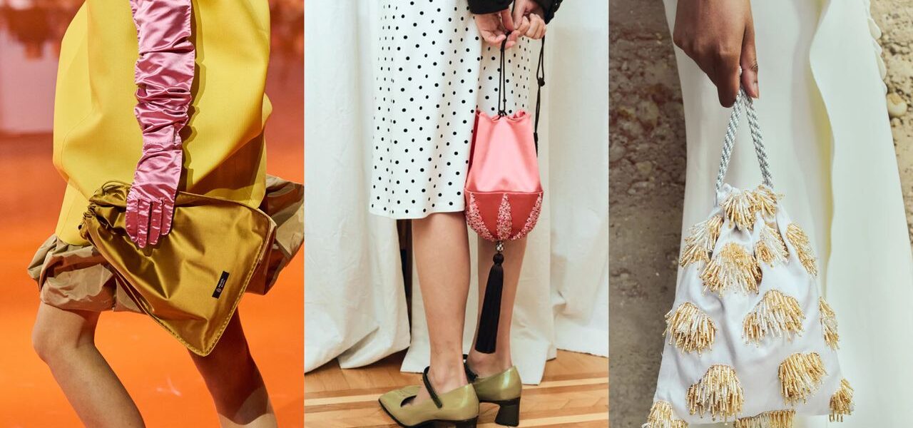 This sense of romance persists today. The spring 2026 collections were filled with delightful purses, from Loewe’s beloved Flamenco pouch to Prada’s colorful silk-satin iterations—the latter a notable street style favorite, spotted in the hands of various It girls and editors outside Prada’s fall-winter 2026 show. Equally enchanting this fashion month were Celine’s colorful leather pouches—particularly in cobalt blue, a trending hue—as seen on Ramya Giangola and Yumi Shin below.