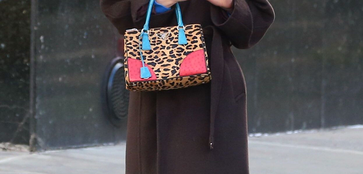 The actor bundled up in earth-colored layers for a springtime walk in New York City, pairing a sumptuous, chocolatey brown coat with mushroom-brown trousers and off-white Salomon Mary-Janes. And while Lawrence could have easily finished the look with one of her many, many quiet luxury It-bags (her black Kelly, her Loewe Puzzle, her Phoebe Philo Gig bag…need we go on?), she chose to defy our expectations. Instead, she grabbed a boxy Prada Galleria with a leopard-print body complete with a turquoise ostrich leather top handle, and red ostrich leather accents.